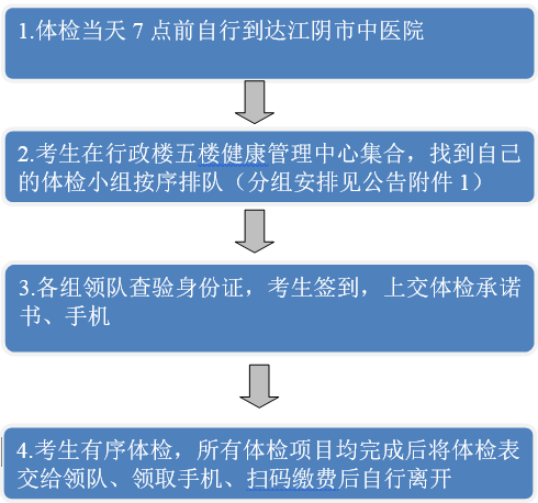 1.請(qǐng)考生帶好身份證原件(其余證件一律無(wú)效)、體檢承諾書(shū)(見(jiàn)附件2,請(qǐng)預(yù)先下載填寫(xiě)好)于體檢當(dāng)天早上7:00前到江陰市中醫(yī)院(人民中路130號(hào),公交6路、8路、9路、10路、15路等到中山站下車(chē)向東步行100米左右)行政樓五樓健康管理中心集合。體檢費(fèi)由考生自理(450元,手機(jī)掃碼支付)。逾期未到者,作自動(dòng)放棄處理。