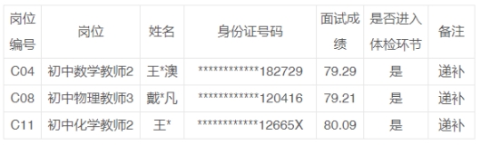 根據(jù)《無(wú)錫高新區(qū)(新吳區(qū))教育系統(tǒng)2024年引進(jìn)優(yōu)秀青年人才公告(二)》(錫人社事招公告?zhèn)鋄2024]14號(hào))精神,因部分考生放棄在我區(qū)的擇業(yè)資格,按照?qǐng)?bào)考同一崗位的人員,面試成績(jī)從高到低依次遞補(bǔ)的原則,現(xiàn)有以下考生遞補(bǔ)進(jìn)入體檢環(huán)節(jié):