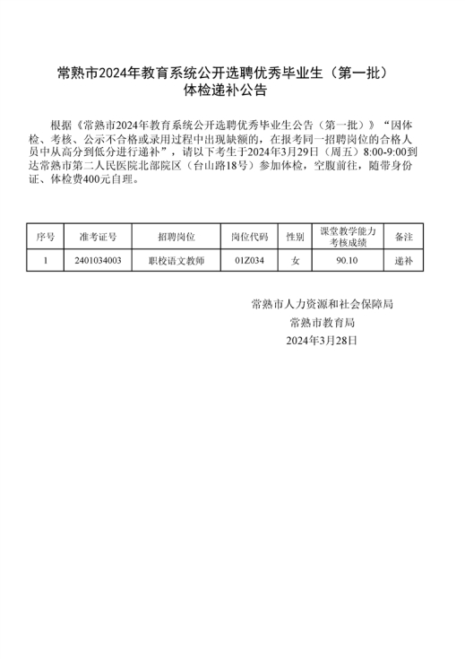 2024年蘇州常熟市教育系統(tǒng)公開(kāi)選聘優(yōu)秀畢業(yè)生(第一批)體檢遞補(bǔ)公告