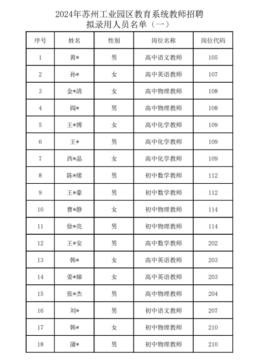 根據(jù)《蘇州工業(yè)園區(qū)2024年第一次高層次、緊缺型教育人才招聘公告》,經(jīng)過資格審核、考核、體檢等程序,擬錄用以下18位同志(詳見附件),現(xiàn)進行公示。
