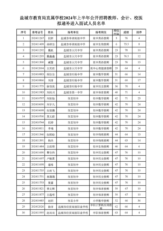 2024年鹽城市教育局直屬學(xué)校上半年公開招聘教師、會(huì)計(jì)、校醫(yī)擬遞補(bǔ)進(jìn)入面試人員名單