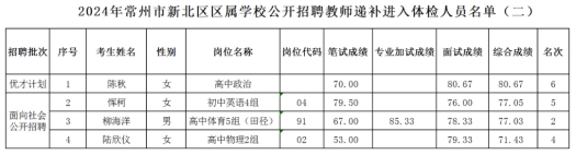 在2024年常州市新北區(qū)區(qū)屬學(xué)校公開招聘教師過程中,部分崗位人員因個人原因放棄。根據(jù)《2024年常州市新北區(qū)區(qū)屬學(xué)校公開招聘教師公告》有關(guān)規(guī)定,擬在報考同崗位面試合格人員中按綜合成績從高分到低分依次遞補(bǔ),參加遞補(bǔ)體檢相關(guān)事項將另行通知。具體崗位和遞補(bǔ)進(jìn)入體檢人員見附件。