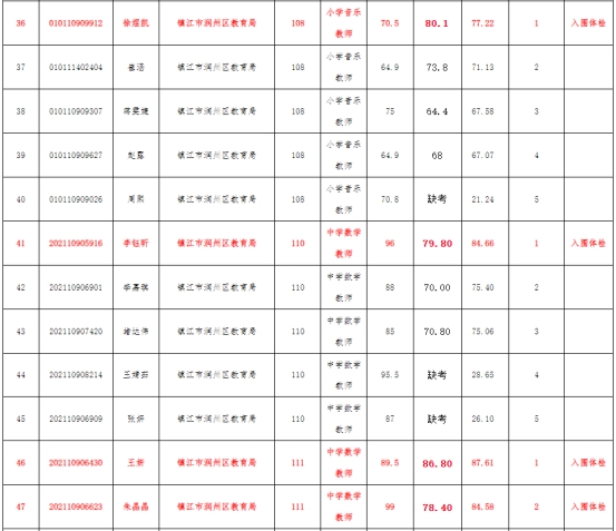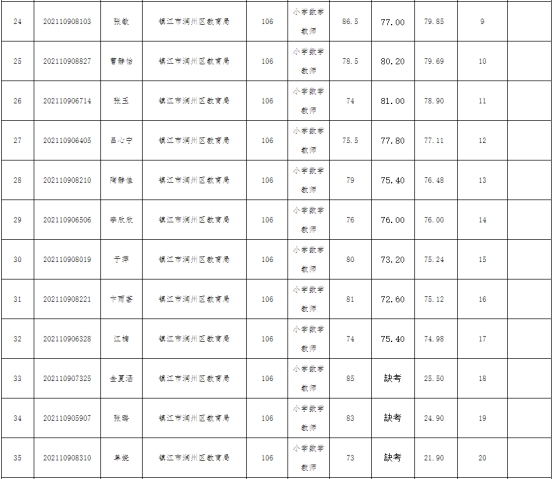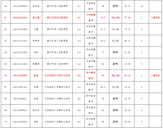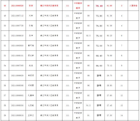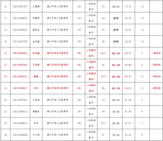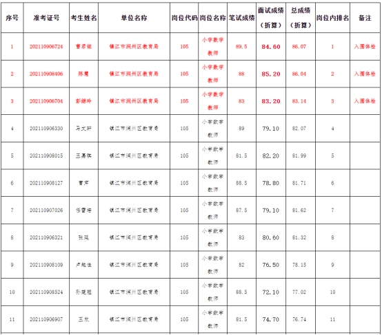 根據(jù)《2024年鎮(zhèn)江市潤州區(qū)教育系統(tǒng)公開招聘教師公告》規(guī)定,現(xiàn)將2024年潤州區(qū)教師招聘總成績(第二批)公告如下,表中紅色字體標(biāo)注人員為入圍體檢、考察人選。公告時(shí)間為6月24日至6月26日,公告結(jié)束后將組織入圍考生進(jìn)行體檢、考察,具體時(shí)間和地點(diǎn)另行通知。咨詢電話:潤州區(qū)教育局 0511-85589160;監(jiān)督電話:潤州區(qū)教育局0511-85589112區(qū)人社局0511-81988369區(qū)紀(jì)委監(jiān)委0511-12388。