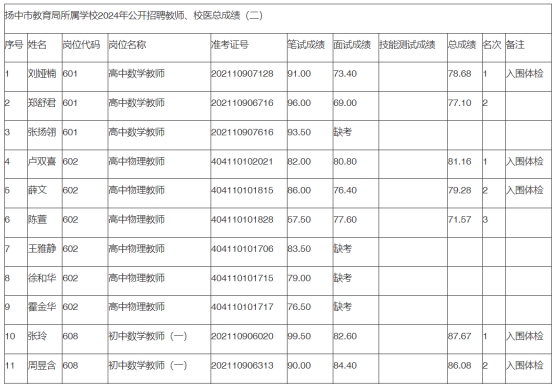 根據(jù)《揚中市教育局所屬學校2024年公開招聘教師、校醫(yī)公告》(鎮(zhèn)揚事招備案〔2024〕3號)規(guī)定,現(xiàn)將部分崗位(崗位代碼為601、602、608、609、612、619、620、625)考試總成績予以公布,如有異議請與揚中市教育局(0511—88323215)聯(lián)系。公示時間為2024年6月26日至6月28日。