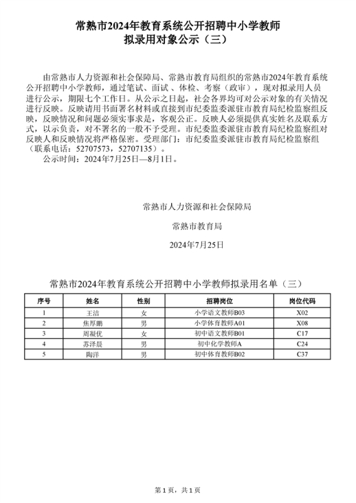 2024年蘇州常熟市教育系統(tǒng)公開招聘中小學(xué)教師擬錄用對象公示(三)