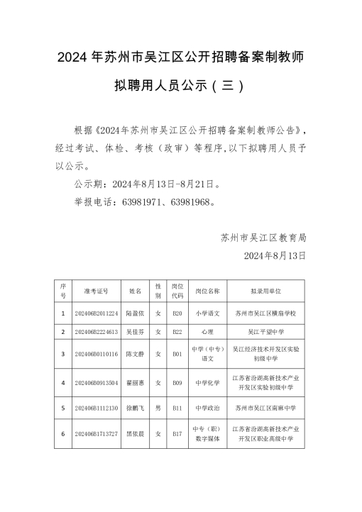 2024年蘇州市吳江區(qū)公開(kāi)招聘?jìng)浒钢平處煍M聘用人員公示(三)