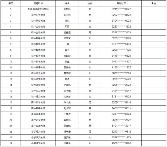 根據(jù)《2024年蘇州高新區(qū)教育系統(tǒng)選聘優(yōu)秀畢業(yè)生公告》要求,經(jīng)過(guò)報(bào)名、資格初審、考試、資格復(fù)審、體檢考察合格,現(xiàn)面向社會(huì)公示擬錄用人員名單。