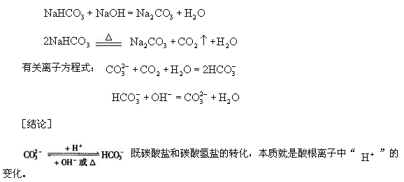 根據(jù)Na2CO3和NaHCO3的相互轉(zhuǎn)化,不僅可掌握碳酸鹽、碳酸氫鹽相互轉(zhuǎn)化的一般規(guī)律,同時要指出Na2CO3和NaHCO3在固態(tài)時和溶液中要用不同的檢驗方法,在固態(tài)時,可用加熱法,在溶液中則需選用BaCl2溶液和CaCl2溶液,而決不能用Ca(OH)2溶液或Ba(OH)2溶液。