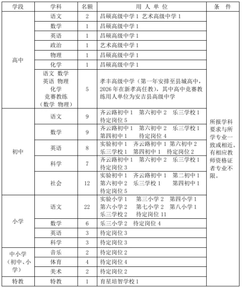 政治素質好,遵紀守法,品行端正,身體健康。有志于長期在安吉從事教育教學工作,有較強的敬業(yè)精神和團結協(xié)作能力,本科和碩士研究生年齡在30周歲以下(1993年10月23日以后出生),博士研究生和高中招聘第4條及第5條、中小學招聘第5條的年齡在35周歲以下(1988年10月23日以后出生),具有中華人民共和國國籍,且符合下列條件之一的人員均可報名。