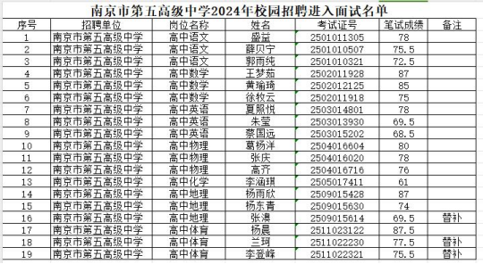 根據(jù)《江蘇省事業(yè)單位公開招聘人員辦法》(蘇辦發(fā)[2020]9號(hào))、關(guān)于印發(fā)《江蘇省事業(yè)單位公開招聘人員面試暫行辦法》的通知(蘇人社發(fā)[2013]325號(hào)),依據(jù)2023年10月17日發(fā)布的《南京市教育系統(tǒng)部分事業(yè)單位2023年公開招聘教師公告》的公告(寧事招公告(R)〔2023〕30號(hào)》),現(xiàn)將進(jìn)入資格復(fù)審人員名單公告如下。