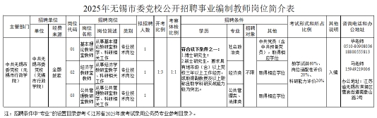 按照《江蘇省事業(yè)單位公開招聘人員辦法》(蘇辦發(fā)〔2020〕9號)文件精神,無錫市委黨校2025年面向社會公開招聘事業(yè)編制教師3名,F(xiàn)將有關(guān)事項(xiàng)公告如下: