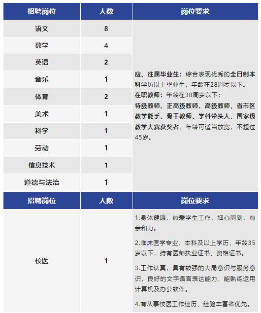 體育教師:足球、花樣跳繩、啦啦操專業(yè)或特長(zhǎng)者優(yōu)先,大學(xué)期間曾任團(tuán)委書記優(yōu)先;
