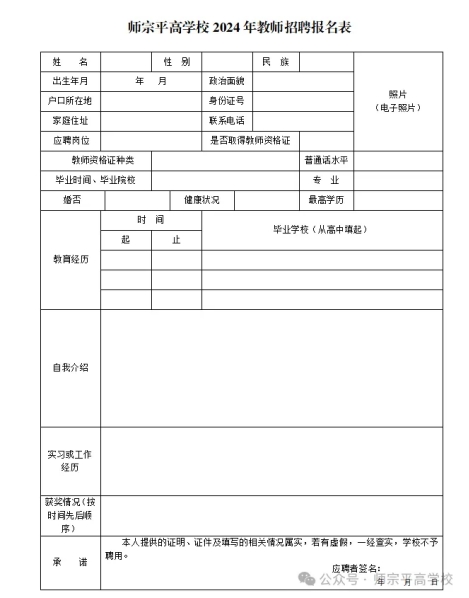 1.簡(jiǎn)歷投遞:即日起,把簡(jiǎn)歷、報(bào)名表(參照文末樣式自行制作)、相關(guān)學(xué)歷證書、表?yè)P(yáng)獎(jiǎng)勵(lì)等材料打包發(fā)送至師宗平高學(xué)校郵箱(郵箱號(hào):361661332@qq.com;qjshizongpgxx@163.com);郵件標(biāo)題統(tǒng)一以“姓名+畢業(yè)院校+應(yīng)聘崗位”格式命名。