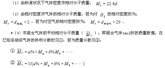 3.氣體摩爾體積的常見(jiàn)應(yīng)用 標(biāo)準(zhǔn)狀況下1mol氣體為22.4L,即可導(dǎo)出其質(zhì)量便是該氣體的摩爾質(zhì)量。據(jù)此可求出未知化學(xué)式的氣體摩爾質(zhì)量和相對(duì)分子質(zhì)量,也可求出1L氣體的質(zhì)量即氣體密度。反之也可由氣體密度求摩爾質(zhì)量。同溫同壓下兩氣體的密度比叫氣體的相對(duì)密度,可據(jù)以由氣體的相對(duì)密度求氣體的摩爾質(zhì)量,如某氣體對(duì)H2的相對(duì)密度為15,則其相對(duì)分子質(zhì)量為15×2。常見(jiàn)的有: