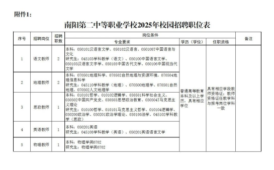 南陽(yáng)第二中等職業(yè)學(xué)校位于南陽(yáng)市人民南路470號(hào),隸屬南陽(yáng)市教育局,財(cái)政全供事業(yè)單位,省職業(yè)教育特色院校、省級(jí)文明校園、省級(jí)衛(wèi)生先進(jìn)單位。為加強(qiáng)新時(shí)代教師隊(duì)伍建設(shè),推動(dòng)我校教育事業(yè)高質(zhì)量發(fā)展,根據(jù)學(xué)校教師需求,決定開(kāi)展南陽(yáng)第二中等職業(yè)學(xué)校2025年校園招聘活動(dòng)。具體事項(xiàng)公告如下: