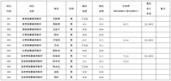 根據(jù)《江蘇省蘇州中學(xué)校面向社會長期公開招聘學(xué)科競賽輔導(dǎo)教師公告》要求,現(xiàn)將本次招聘筆試成績、面試成績、總成績及進(jìn)入體檢人員名單公示: