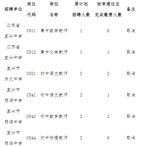 2025年江蘇省宜興市教育系統(tǒng)公開(kāi)招聘優(yōu)秀人才報(bào)名工作已結(jié)束,經(jīng)審核,部分崗位最終報(bào)考人數(shù)少于該崗位招聘人數(shù)的3倍,未能達(dá)到開(kāi)考比例。按照《2025年江蘇省宜興市教育系統(tǒng)公開(kāi)招聘優(yōu)秀人才公告》(錫人社事招公告?zhèn)洹?025〕4號(hào))精神,需相應(yīng)取消、核減部分招聘崗位計(jì)劃,現(xiàn)將取消(核減)崗位公告如下: