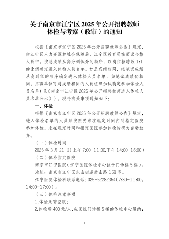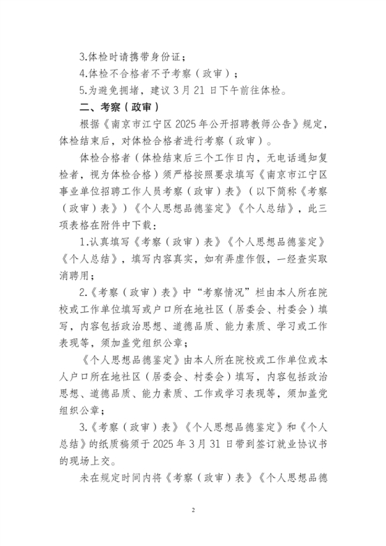 2025年關(guān)于南京市江寧區(qū)公開招聘教師體檢與考察(政審)的通知
