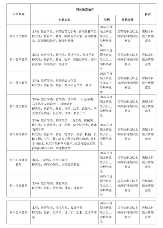 為進一步加強我校教師隊伍建設(shè),擬從2025應(yīng)屆優(yōu)秀畢業(yè)生中對外公開招聘語文、數(shù)學、英語、道德與法治、物理、心理健康、體育、美術(shù)學科教師。具體崗位如下: