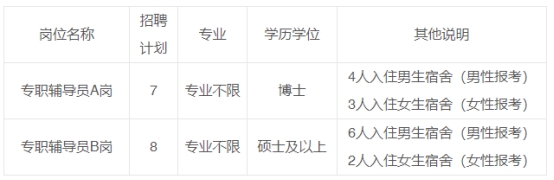 專職輔導員15人(其中10人需入住男生宿舍,5人需入住女生宿舍),納入事業(yè)編制管理。