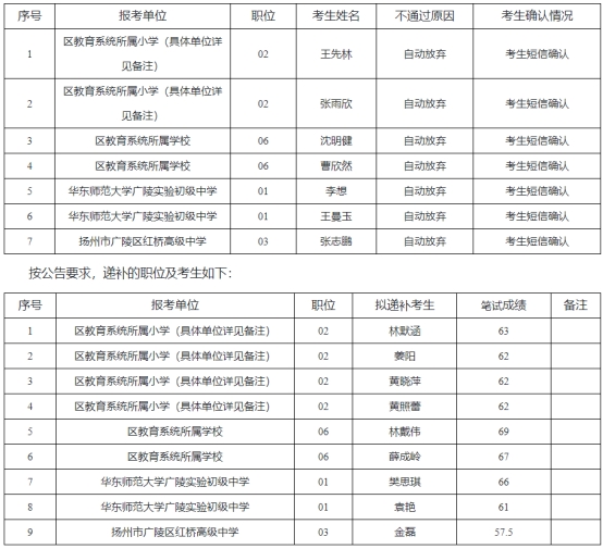 按照《2025年4月?lián)P州市廣陵區(qū)教育系統(tǒng)事業(yè)單位公開(kāi)招聘教師公告》要求,截止目前,共有7名考生確認(rèn)放棄,具體如下: