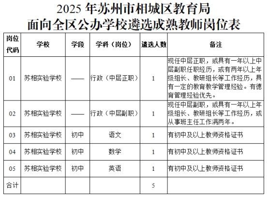 遴選崗位詳見《2025年蘇州市相城區(qū)教育局面向全區(qū)公辦學(xué)校遴選成熟教師崗位表》(附件1)。