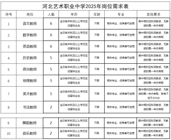 學(xué)校目前開(kāi)設(shè)有文化高考升學(xué)班(文科實(shí)驗(yàn)班和理科實(shí)驗(yàn)班)及藝術(shù)高考升學(xué)班,設(shè)有美術(shù)、書(shū)法、音樂(lè)、舞蹈、民航運(yùn)輸與服務(wù)、體育六大專(zhuān)業(yè),堅(jiān)持“德育+藝術(shù)+文化”的育人特色,為藝術(shù)生定制課程,形成了專(zhuān)屬教學(xué)體系;開(kāi)創(chuàng)了“藝術(shù)+文化”互融式教學(xué)模式,形成了文專(zhuān)并舉、和諧高效的管理特色。學(xué)校以“厚德、勤學(xué)、尚美、求真”為校訓(xùn),擁有一支“仁愛(ài)而智慧、專(zhuān)注而專(zhuān)業(yè)、靠譜而靈動(dòng)”的專(zhuān)業(yè)化教師隊(duì)伍。因?qū)W校發(fā)展需要,現(xiàn)招聘高中各學(xué)科教師和骨干教師。