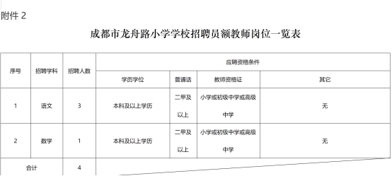 本次招聘員額教師共計(jì)4名(招聘崗位詳見《成都市龍舟路小學(xué)學(xué)校招聘員額教師崗位一覽表》)。