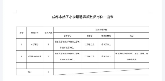 成都市嬌子小學(xué)本次招聘員額教師共計3名(招聘崗位詳見《成都市嬌子小學(xué)招聘員額教師崗位一覽表》)。