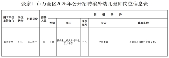 5、具備崗位所需要的其他資格條件。招聘崗位所需的具體條件按《張家口市萬全區(qū)2025年公開招聘編外幼兒教師崗位信息表》(附件)要求確定。