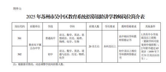 招募崗位及人數(shù)詳見《2025年蘇州市吳中區(qū)教育系統(tǒng)招募銀齡講學教師崗位簡介表》(附件1)。