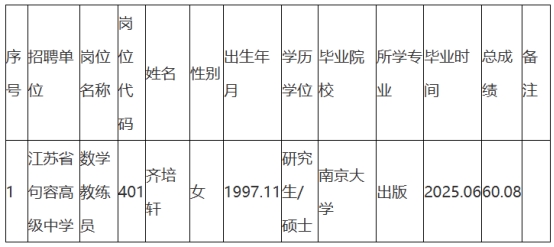 根據(jù)《句容市教育局所屬學(xué)校2025年公開招聘緊缺教育人才公告》(鎮(zhèn)句事招公告〔2025〕4號)經(jīng)資格審查、面試、體檢和考察,現(xiàn)將句容市教育局所屬學(xué)校2025年公開招聘緊缺教育人才擬聘用人員名單予以公示,公示時間2025年8月25日-9月2日。