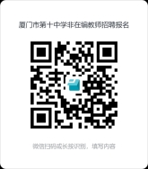 3.線上提交資料:有意者在規(guī)定時(shí)間內(nèi)將《廈門(mén)市第十中學(xué)招聘非在編教師報(bào)名表》(見(jiàn)附件)并附上相關(guān)證書(shū)材料(身份證、畢業(yè)證書(shū)、學(xué)位證書(shū)、教師資格證書(shū)、其他可證明自己工作能力和業(yè)績(jī)材料等)電子文檔及證書(shū)掃描件成一個(gè)PDF文件,文件以“應(yīng)聘崗位+姓名”命名。