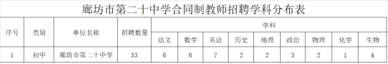 根據(jù)工作需要,現(xiàn)面向參加廊坊市安次區(qū)2025年(編制)教師招聘,報考廊坊市第二十中學相應學科崗位,已經(jīng)面試考試且成績在本學科排名前80%,但沒有進入考核環(huán)節(jié)的非安次區(qū)現(xiàn)有合同制教師考生(放棄考核資格的考生禁止報考),開展廊坊市第二十中學合同制教師招聘工作。
