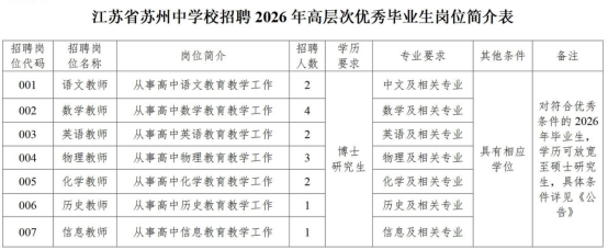 招聘崗位及條件等詳見《江蘇省蘇州中學(xué)校招聘2026年高層次優(yōu)秀畢業(yè)生崗位簡介表》(附件1),可在江蘇省蘇州中學(xué)校官網(wǎng)(http://www.szzx1000.cn)、蘇州市教育局網(wǎng)站(http://jyj.suzhou.gov.cn)及蘇州市人力資源和社會(huì)保障網(wǎng)(http://hrss.suzhou.gov.cn)上查詢。