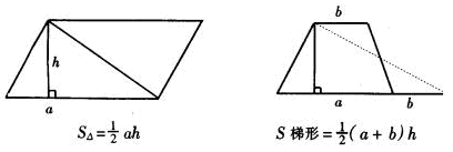 (出示投影1)。解釋三角形,梯形面積公式