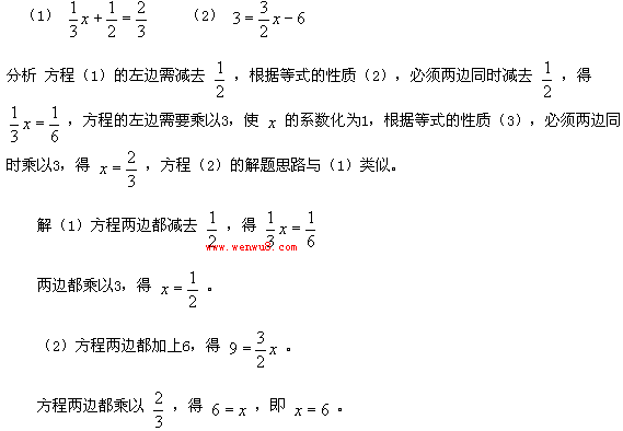 (2)解簡易方程,要在學生積極參與的基礎(chǔ)上,理解何種形式的方程在求解過程中方程兩邊選擇加上(或減去)同一個數(shù),以及何種形式的方程在求解過程中兩邊選擇乘以(或除以)同一個數(shù)。另一個重要的問題就是“適當?shù)臄?shù)”的選擇了。通常,整式方程并不需要檢驗,但為了學生從一開始就養(yǎng)成自我檢查的好習慣,可以讓學生在草稿紙上檢驗,同時也是對前面學過的求代數(shù)式的值的復習。