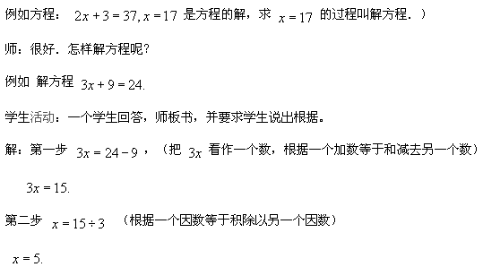 師:好!這是小學學的解方程的方法。在初中代數課上,我們要從另一角度來解,還以上邊這個方程為例。