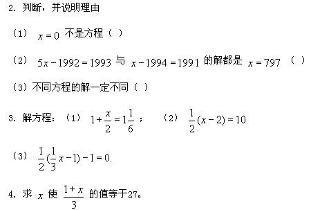 【教法說(shuō)明】1題讓學(xué)生困難同學(xué)回答,增強(qiáng)自信心;2題澄清模糊認(rèn)識(shí),可充分討論,讓學(xué)生各抒已見;3題較1題稍復(fù)雜,一是讓學(xué)生體會(huì)新解法的優(yōu)越性,二是培養(yǎng)學(xué)生觀察分析解決問(wèn)題的能力;4題其實(shí)也是解方程,目的是開闊學(xué)生思路,培養(yǎng)學(xué)生勇于探索、大膽求異的創(chuàng)新精神。
