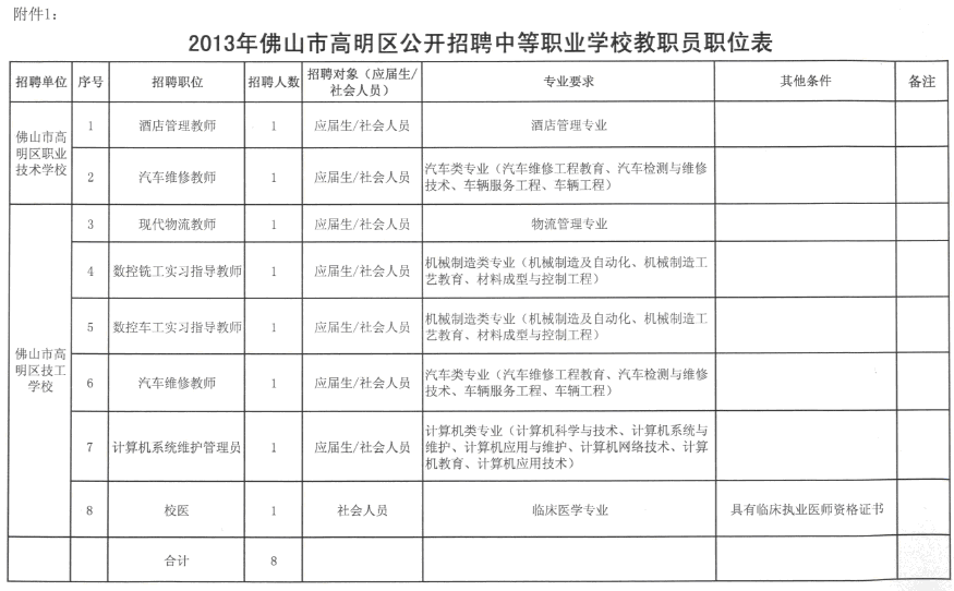 1、2013年佛山市高明區(qū)公開招聘中等職業(yè)學(xué)校教職員職位表