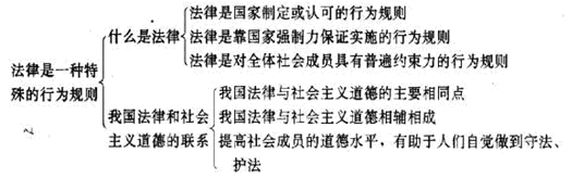 小結(jié):這節(jié)課我們獲得了一個(gè)新的知識(shí):法律和道德都是人們的行為規(guī)則。知道了一個(gè)重要的概念:法律的含義,并明確了法律最主要的牲是靠國(guó)家強(qiáng)制力保證實(shí)施。