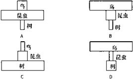 (2001年廣東卷)一片樹林中,樹、昆蟲和食蟲鳥類的個體數(shù)比例關(guān)系如圖所示。下列選項能正確表示樹、昆蟲、食蟲鳥之間的能量流動關(guān)系的是(選項方框面積表示能量的大。 ( C )
