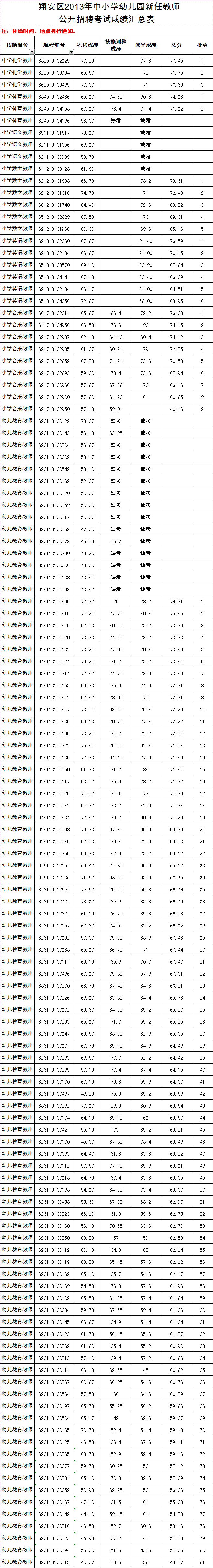 福建省廈門市翔安區(qū)2013年中小學(xué)幼兒園新任教師招聘考試成績匯總表