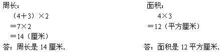出示圖形,這是一個長方形,長4厘米,寬3厘米.請同學提出問題,可以求什么?(周長、面積各是多少?)
