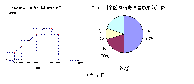 16、某市有A,B,C,D四個區(qū)。A區(qū)2003年銷售了商品房2千套,從2003年到2007年銷售套數(shù)(y)逐年(x)呈直線上升,A區(qū)銷售套數(shù)2009年與2006年相等,2007年與2008年相等(如圖①所示);2009年四個區(qū)的銷售情況如圖②所示,且D區(qū)銷售了2千套。