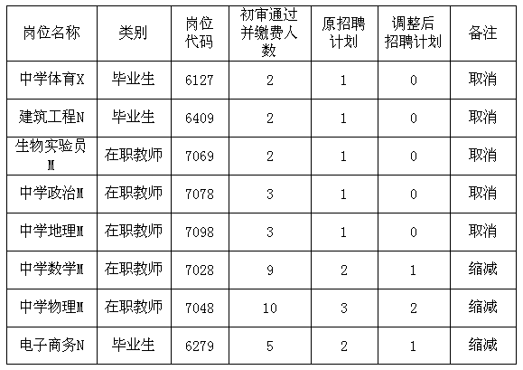 長沙高新區(qū)2014年公開招聘教師工作,已完成報名、資格初審、繳費等程序,根據(jù)《長沙高新區(qū)2014年公開招聘教師簡章》規(guī)定,“各崗位報名人數(shù)與招聘計劃數(shù)的比例達(dá)到5:1(含5:1)方可開考,達(dá)不到此比例則取消或縮減該崗位招聘計劃數(shù)”。根據(jù)報名及資格初審、繳費情況,有中學(xué)體育X(崗位代碼6127)等5個崗位取消招聘計劃,有中學(xué)數(shù)學(xué)M(崗位代碼7028)等3個崗位縮減招聘計劃,具體如下: