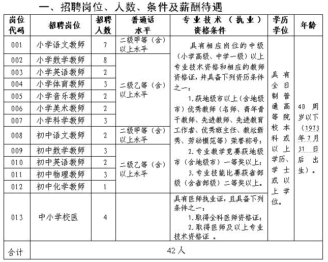 2.應(yīng)聘人員除應(yīng)具備上述基本條件外,應(yīng)聘001-012崗位還應(yīng)具備崗位所需的學(xué)歷學(xué)位、教師資格、專業(yè)技術(shù)資格、資歷、普通話水平和年齡條件,教師資格證和專業(yè)技術(shù)資格證的學(xué)科必須與應(yīng)聘崗位相符;應(yīng)聘013崗位應(yīng)具備崗位所需的專業(yè)(專業(yè)目錄見附件1)、學(xué)歷學(xué)位、專業(yè)技術(shù)(執(zhí)業(yè))資格、資歷和年齡條件。