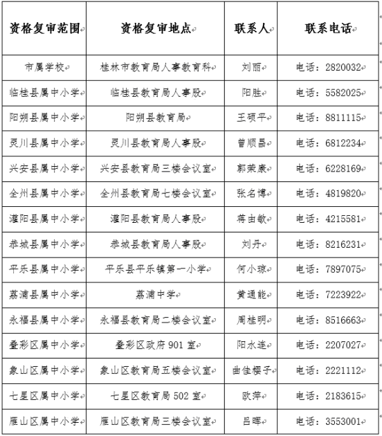 桂林市教育局、人力資源和社會保障局共同對進(jìn)入市屬學(xué)校教師面試資格復(fù)審人選名單的人員進(jìn)行資格復(fù)審;縣(區(qū))教育局、人力資源和社會保障局共同對進(jìn)入本地學(xué)校教師面試資格復(fù)審人選名單的人員進(jìn)行資格復(fù)審。具體安排如下: