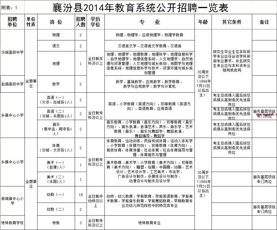 附表1:襄汾縣2014年教育系統(tǒng)公開(kāi)招聘一覽表