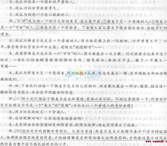 11.閱讀《最后一課》的教學(xué)實(shí)錄(節(jié)選),按要求答題(畫(huà)線語(yǔ)句的序號(hào)與選項(xiàng)的序號(hào)是對(duì)應(yīng)的)! 煟篬A]請(qǐng)大家思考一下:韓麥爾先生是一個(gè)怎樣的人?